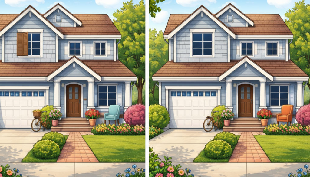 People of all ages enjoy playing brain games like optical illusions and spot-the-difference puzzles. These puzzles will see how well you can pay attention and notice small things. There is a 10-second challenge in this article that will test how well you can see. You have ten seconds to find three things that are different between two pictures of a nice house. You need to hurry because time is running out.