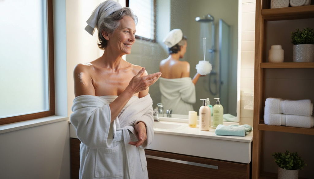 Lightly dab the skin with a towel, then apply a simple moisturizing cream or oil while the skin is still slightly damp. This locks in water instead of letting it evaporate. Clean, comfortable, and confident: redefining “feeling fresh” after 60