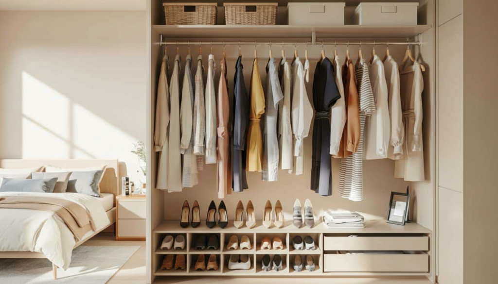 Once the framework is in place, the details do the heavy lifting. Use consistent, slim hangers so clothes sit at the same height and nothing gets visually lost. Put everyday shoes in an open, single layer rack rather than in boxes; seeing them speeds up decisions. Store underwear and socks in shallow drawers or baskets, divided into simple categories like “neutrals”, “sports”, “cosy”. Fewer layers to dig through means less time wasted.