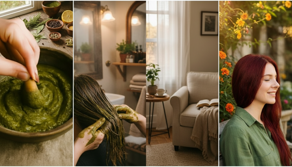 When I first used henna to color my hair, the kitchen smelled like an old drugstore. The air smelled like wet dirt and dried leaves, and it felt warm and strange, like someone had soaked dirt in hot water. There was a ceramic bowl on the counter with a thick, shiny, deep green paste in it that looked like melted chocolate mixed with plant matter. I paused for a moment with the spoon over the bowl and thought about whether this muddy mix could really work as well as the shiny boxes of hair dye at the drugstore. After that, I dipped the brush in the paste, parted my hair, and spread it through my strands. The henna felt cool and thick on my scalp, like a face mask. It also stained my hands and hair, and it changed how I thought about beauty.