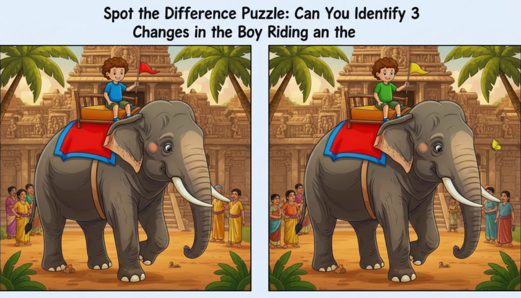 A lot of people still like to play spot-the-difference games. The two pictures look almost the same at first, but there are some small differences between them. When you have to finish the challenge in a certain amount of time, it gets even more fun. In this puzzle, you have 15 seconds to find three small differences between two bright pictures of a boy riding an elephant outside. The pictures might look easy, but the time limit makes them harder.